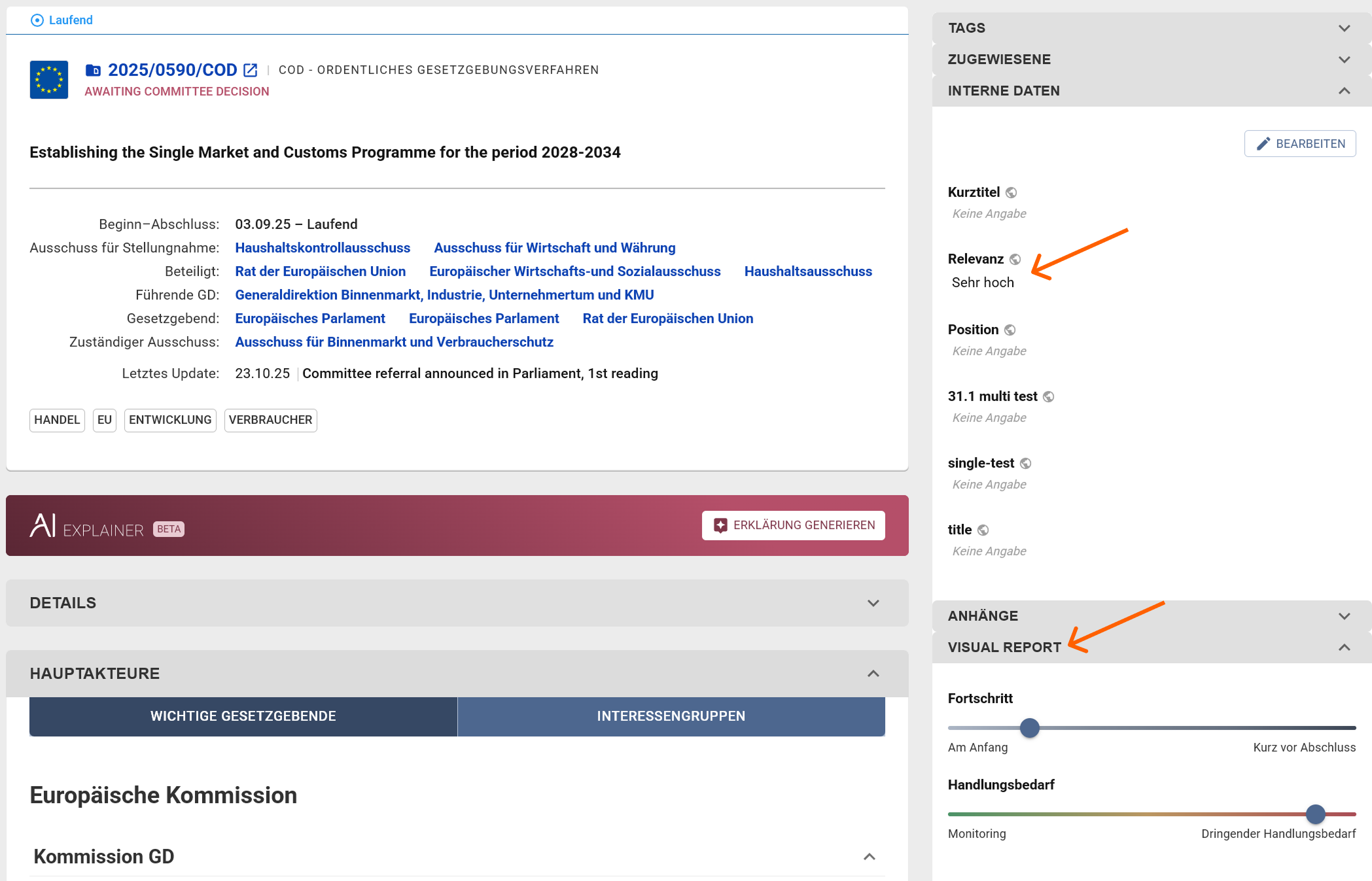 - Fortschritt & Handlungsbedarf: Sie müssen mindestens einen der Schieberegler „Fortschritt“ oder „Handlungsbedarf“ (rechts auf der Detailseite) bearbeitet haben.