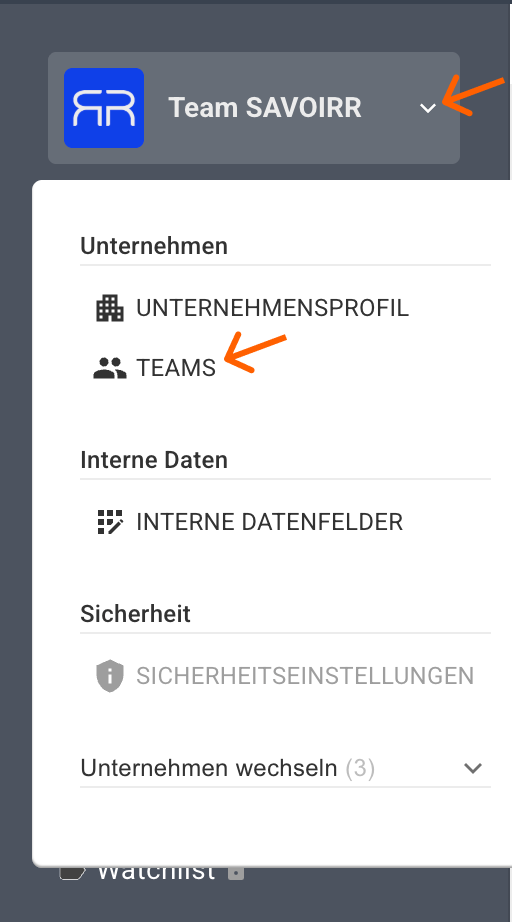 Öffnen Sie das Unternehmensmenü und wählen Sie Teams.